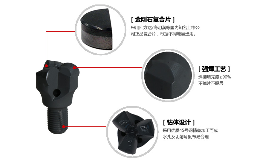 我厂选用金刚石复合片有平片和球形片两种,平片进尺快,应用完整地层。球形片抗冲击能力强,不易崩片,适合破碎及复杂地层。